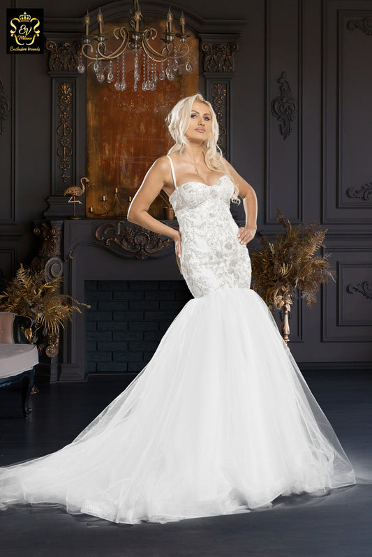 Rochie de mireasa lunga cu bretele subtiri, despicat pe picior si trena EVM-1044