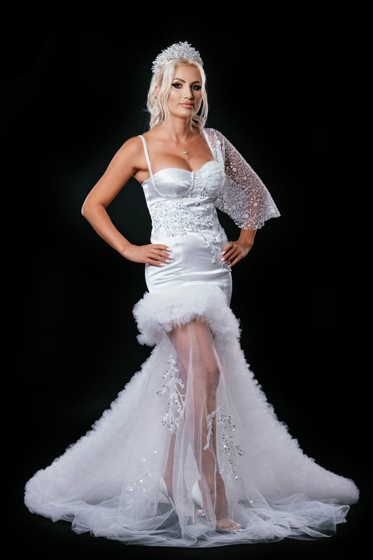 Rochie de mireasa lunga cu maneci scurte si trena din tul EVM-1041