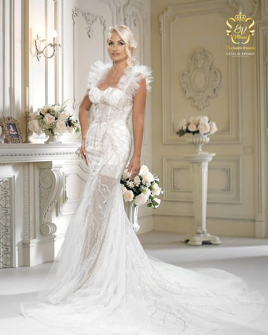 Rochie de mireasa lunga cu bretele din tul si trena EVM-1034